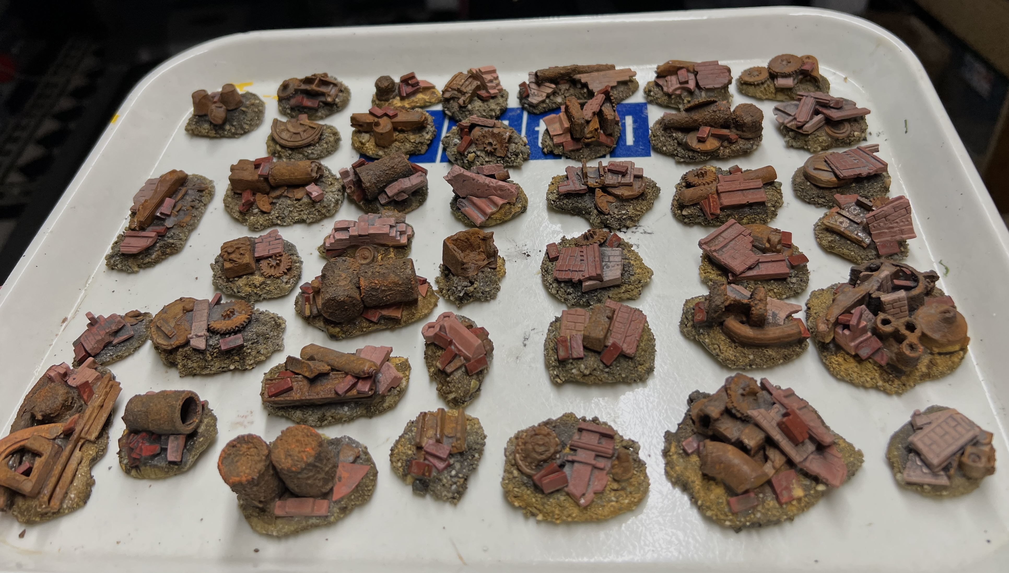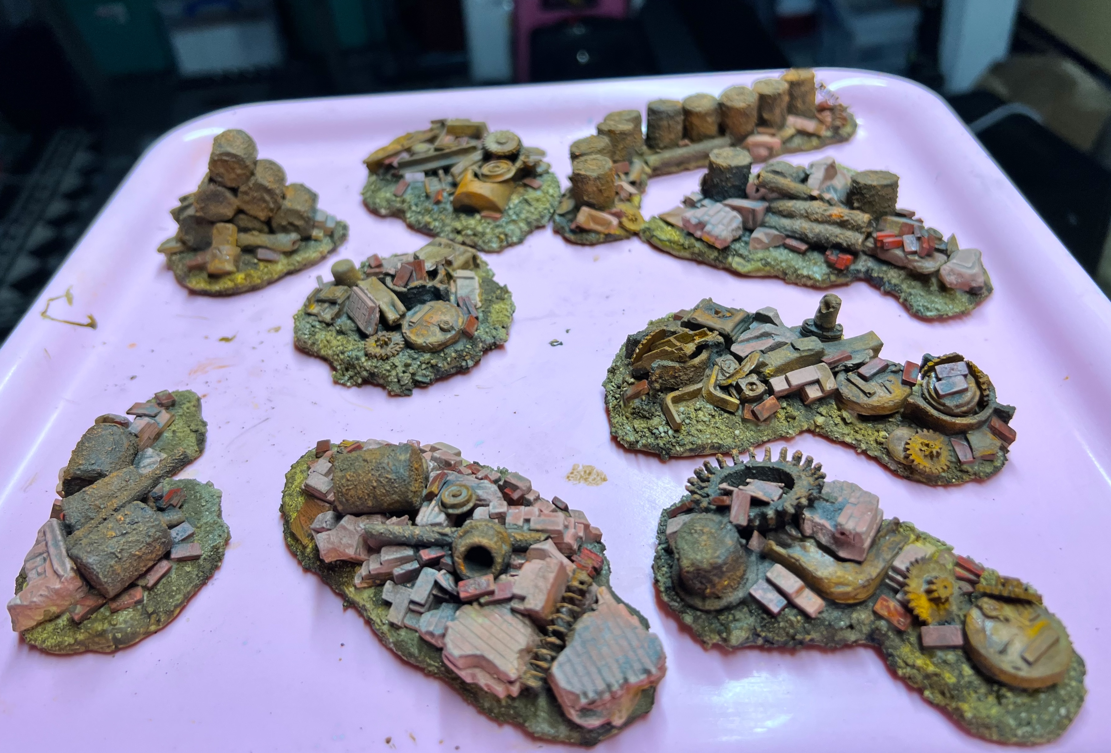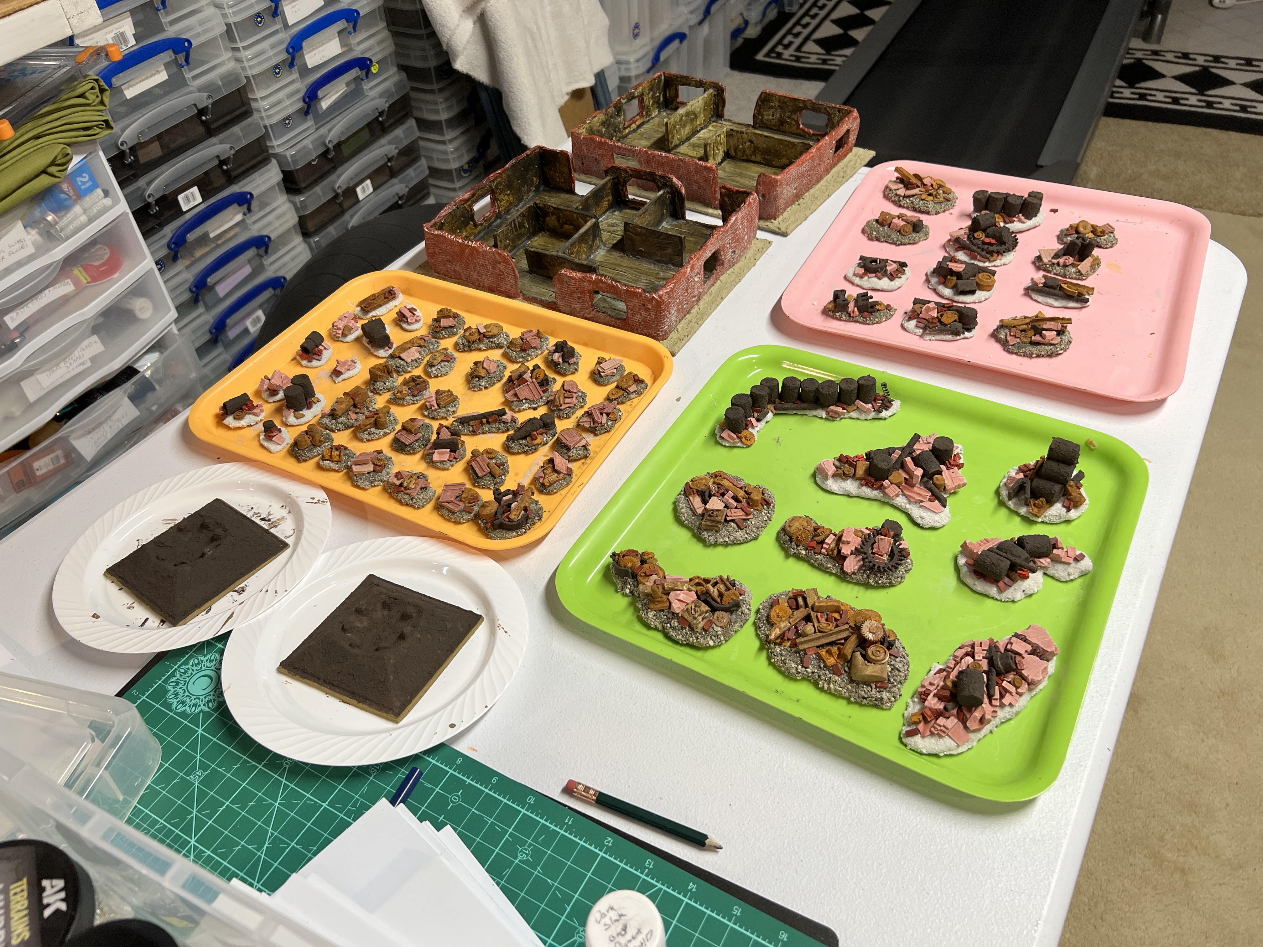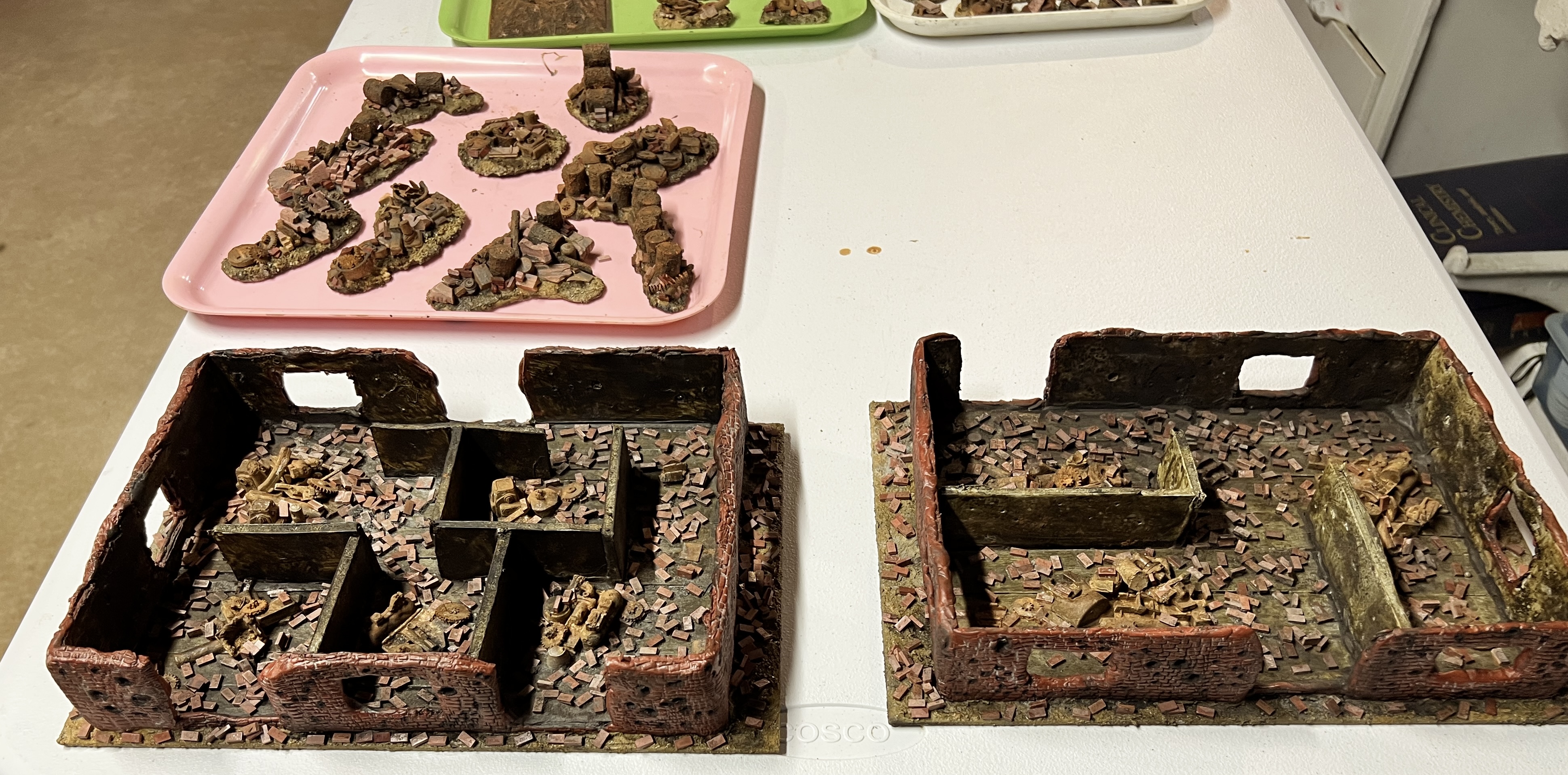 Followers of this blog have seen several posts showing my “rusty” preparations. I have been getting ready for my numerous games at 2026 tabletop wargaming conventions. That preparation involves painting up figures and terrain for scenarios that involve a good amount of ruins and wreckage.