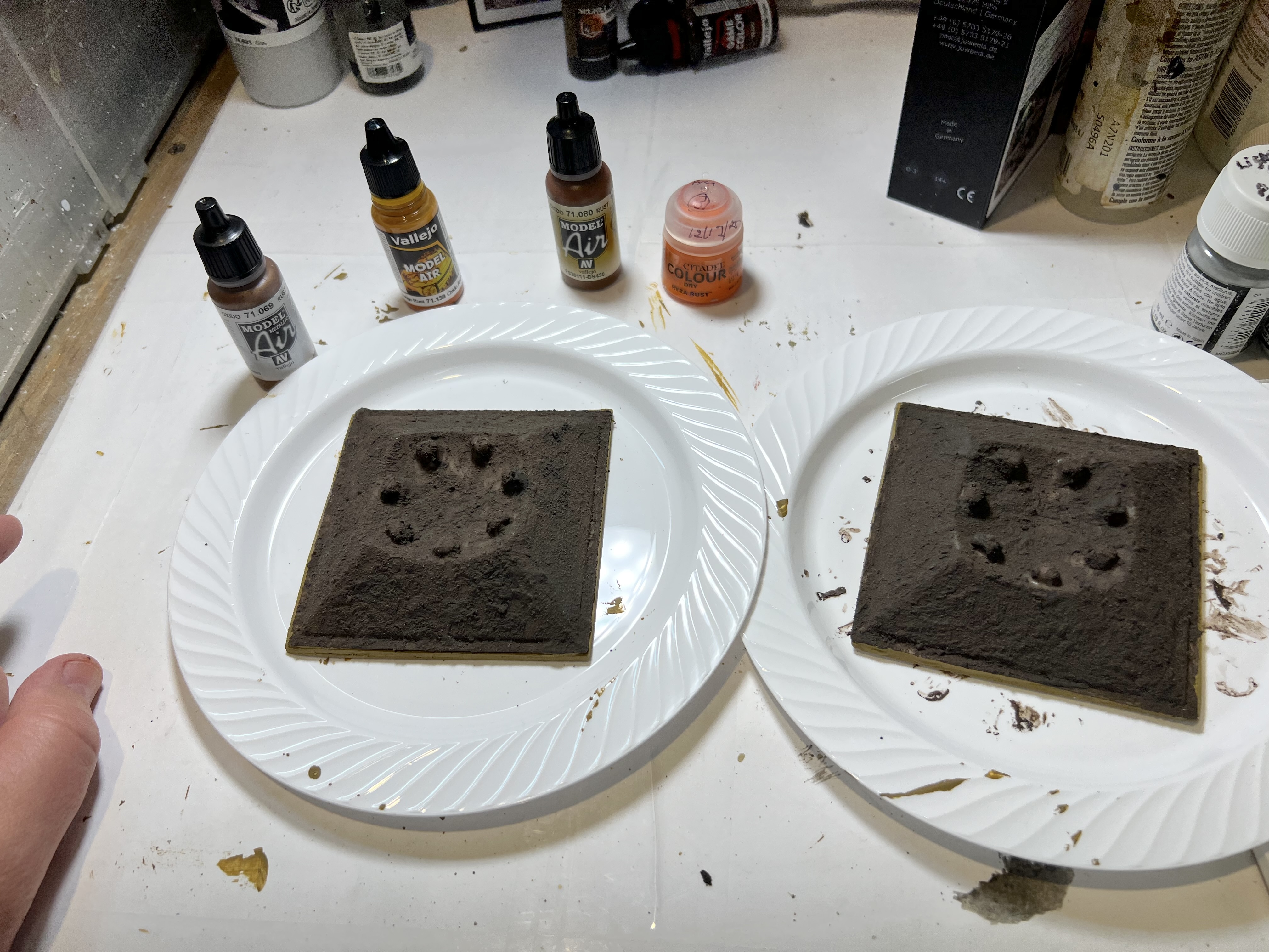 Below you can see the wreckage bases after I added pigments to them. I fixed the pigments with Vallejo Thinner applied with a spray from a lens cleaning bottle.