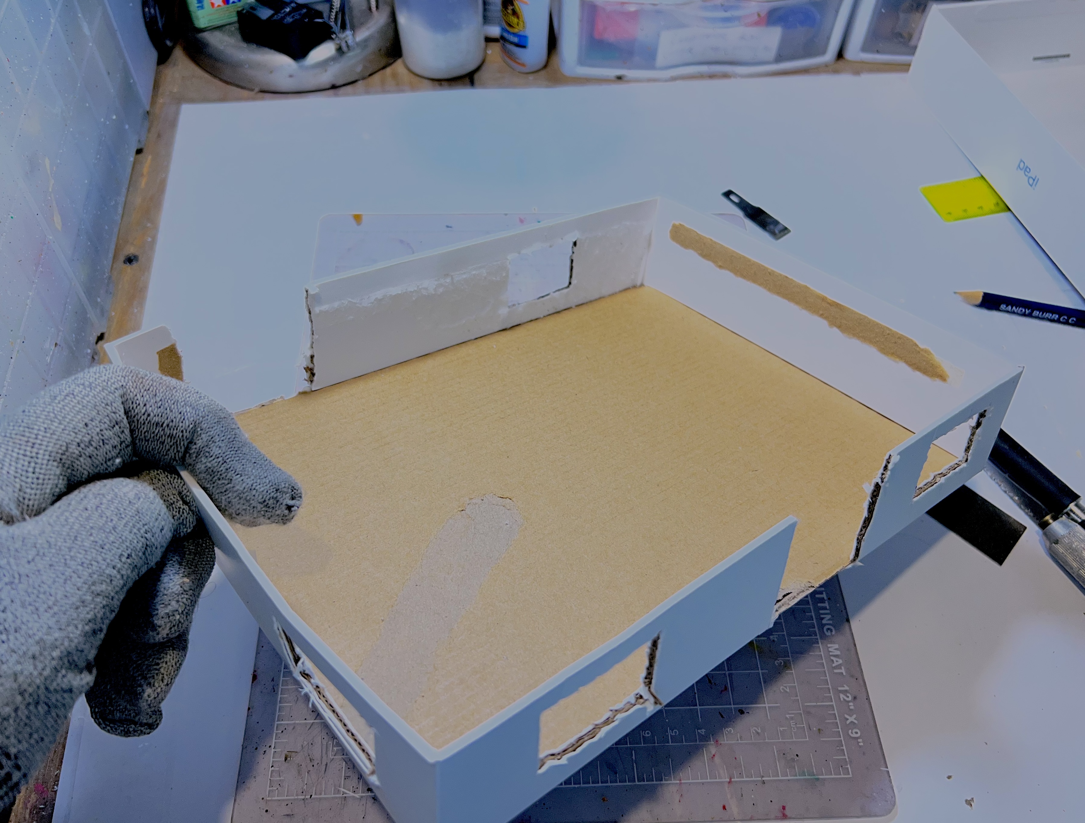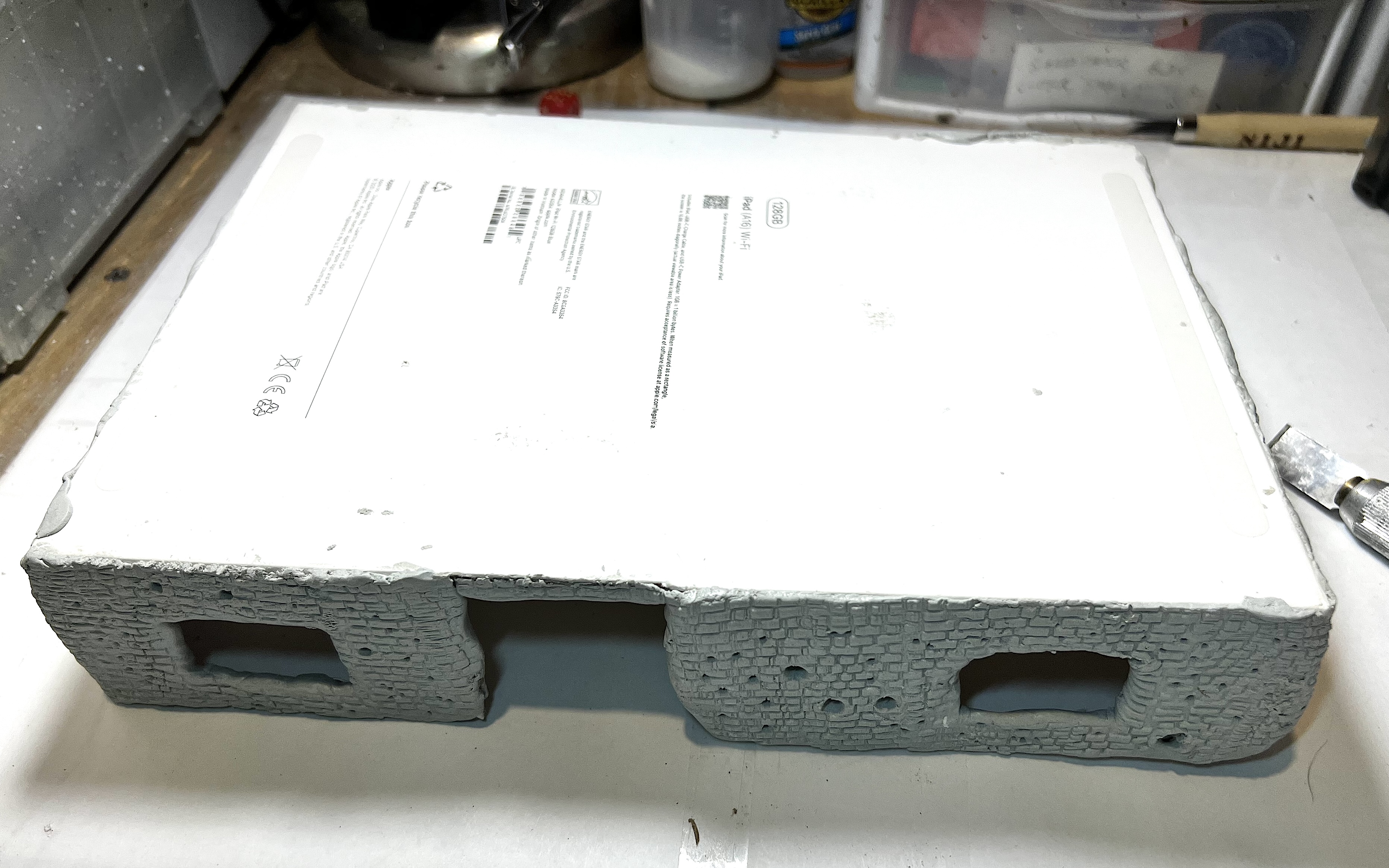 For the two buildings, I converted an iPad 16 box top and bottom. I used Apoxie Sculpt, steel washers, sand, multiple pieces of plastic, desiccant cylinders, and a lot of Juweela items to make the 61 scatter bases. And for two flat industrial structures, I reused two pieces of packing materials to repurpose them as flat rusted structures.