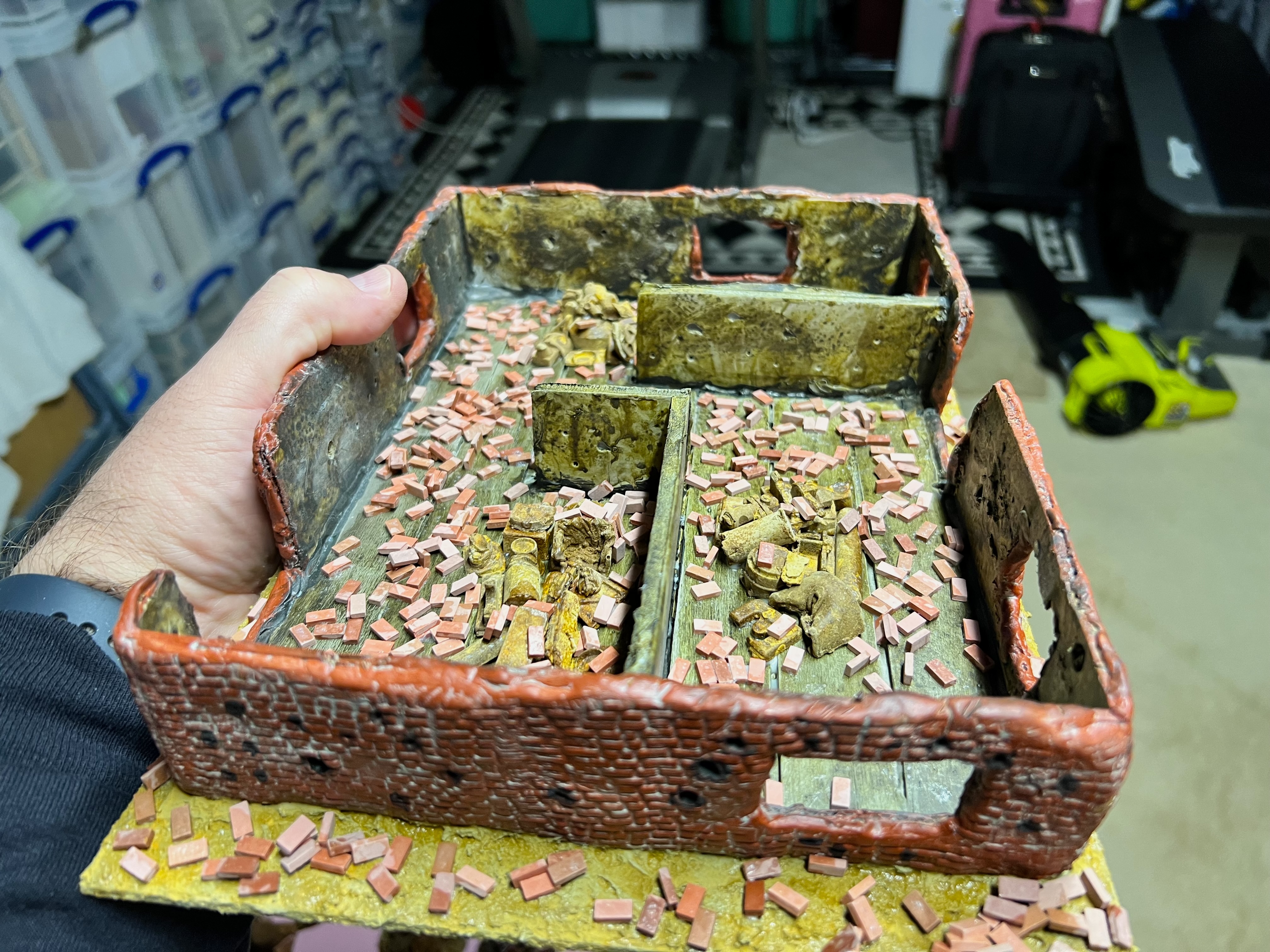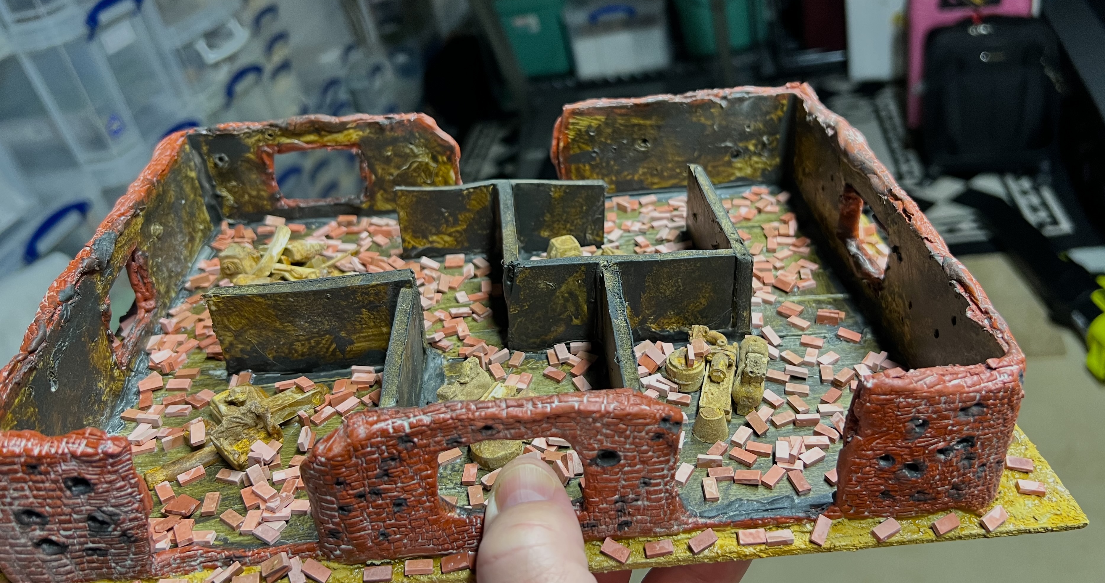 Clearly, pigments were needed at this point to make the bricks and wreckage look older and dirtier. More pigments and dark washes to the rescue!
