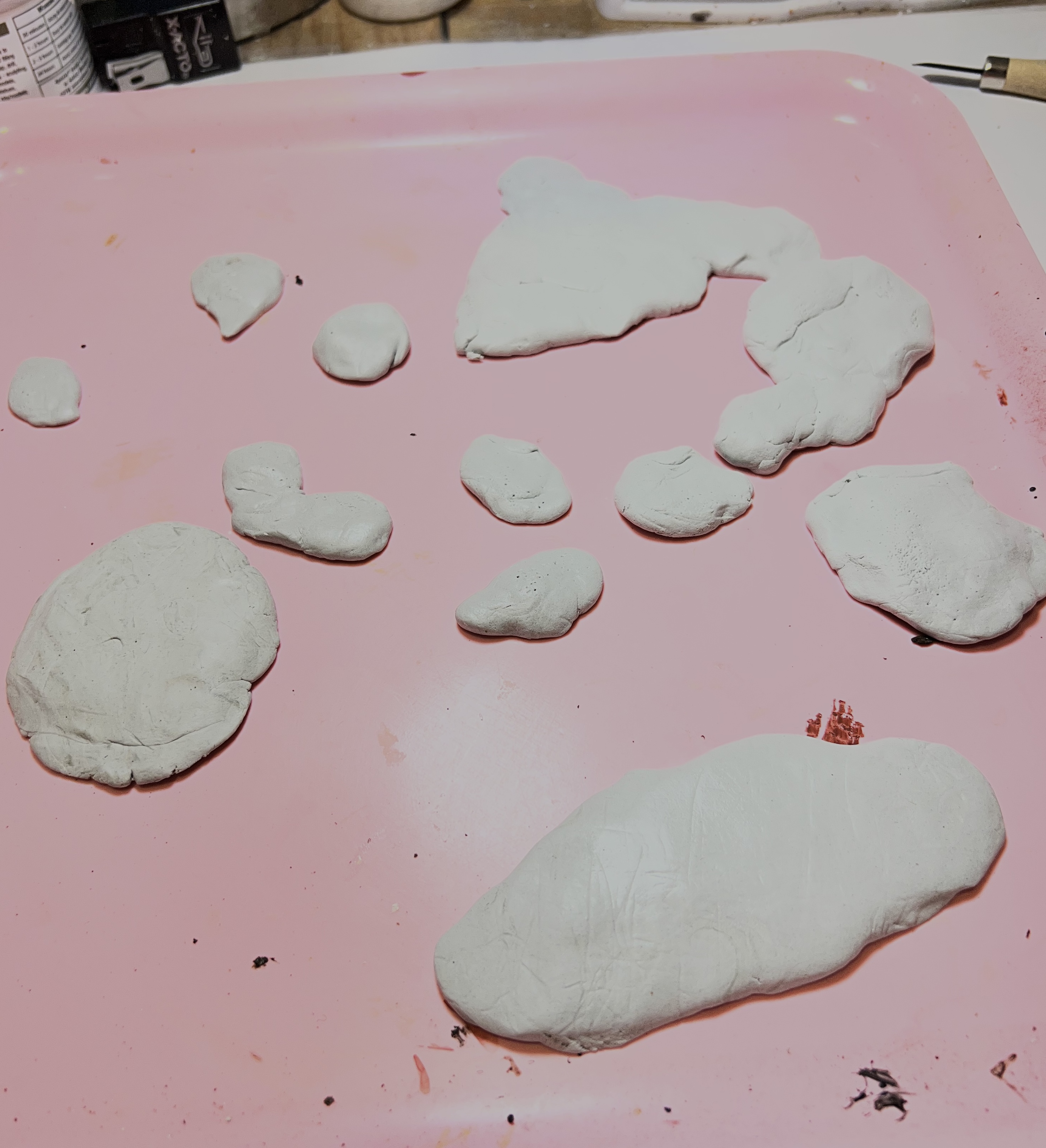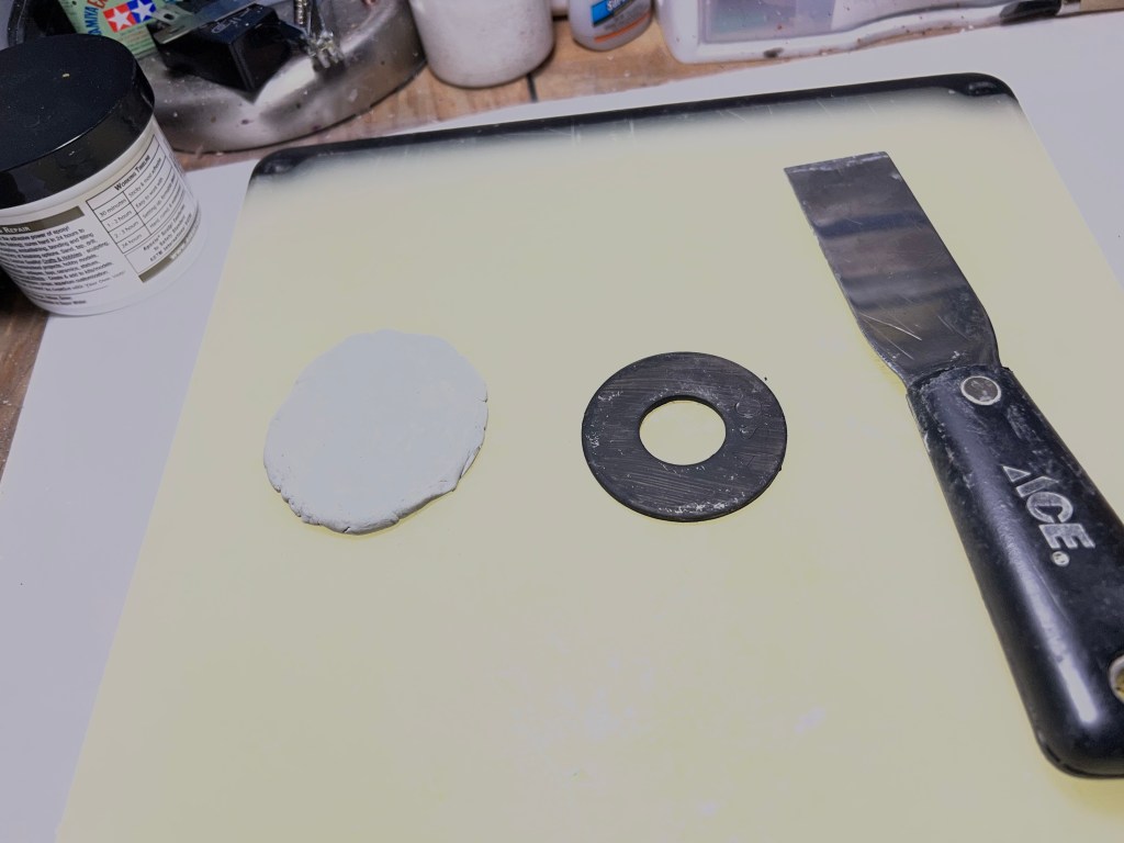 While the walls cured, I worked on the wreckage bases – also using Apoxie Sculpt. I made the bases differently in terms of both size and shape. It helped to use one or more steel washers underneath the base sculpts. Using different sizes helped to make the shapes varied.