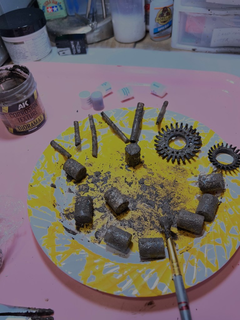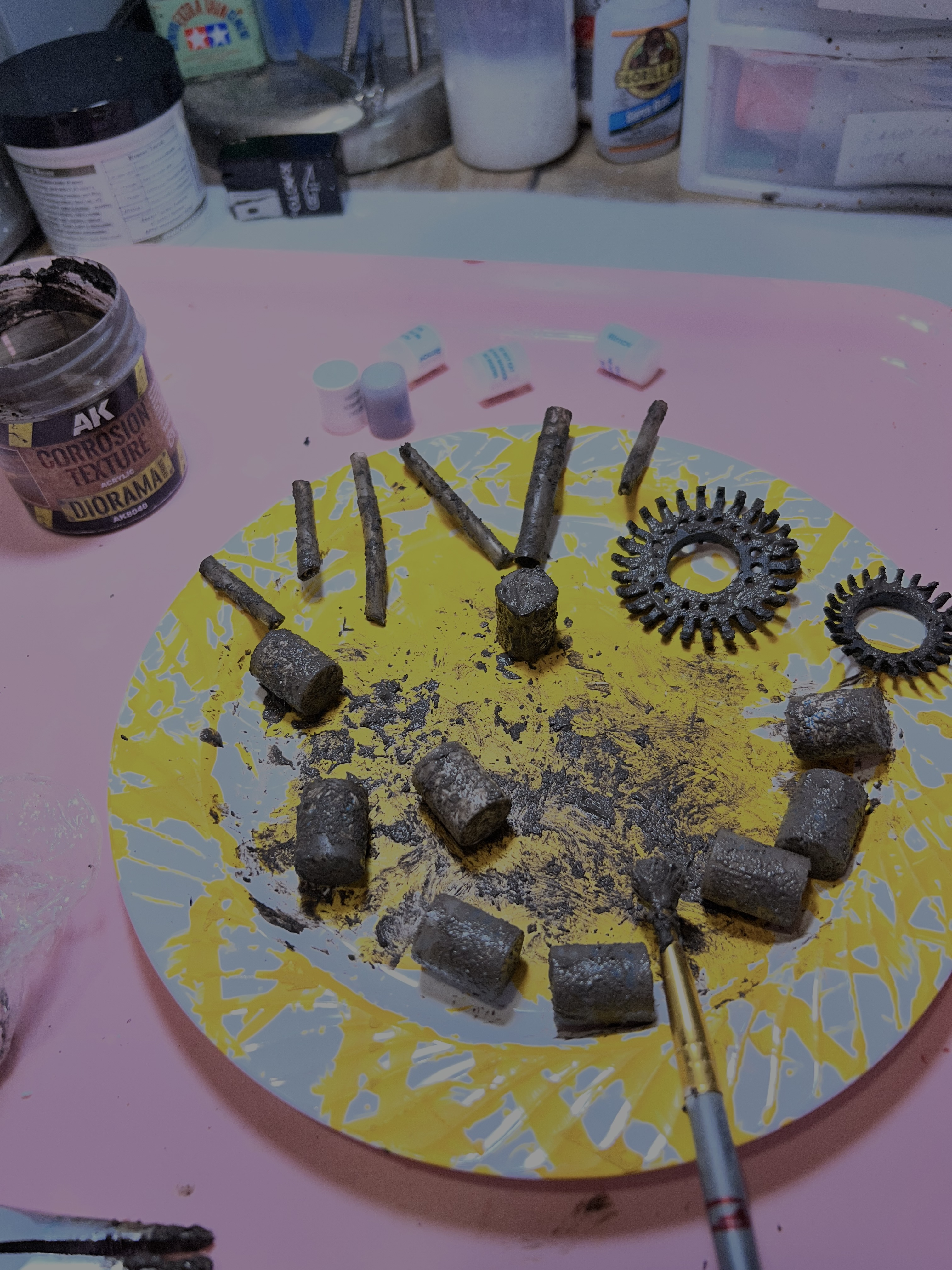 As the corrosion texture paint takes time to dry as well, I started adding that to various pieces of debris that I had saved up. I like to use a cheap old brush that could serve no other purpose – especially as it usually destroys it. The corrosion paint needed to dry and then got a second application.