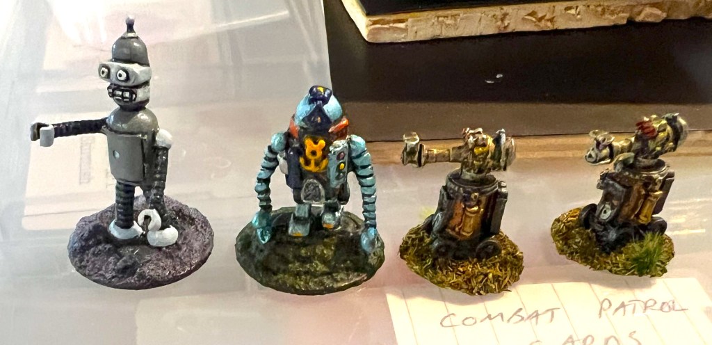 The wreckage (all 61 pieces and the buildings really helped complete my vision. There are 24 possible search locations for the 4 ancient robots, known only to the GM. The four ancient robots I used were: “Folder Bot 3000” (aka Bender) from Armorcast Terraform Terrain Ltd.’s “Robot Townies” collection; and “RT22” from old Archive miniatures Star Rovers line circa 1977; and two Archive Miniatures Robot Cooks also circa 1977 (also Star Rovers).